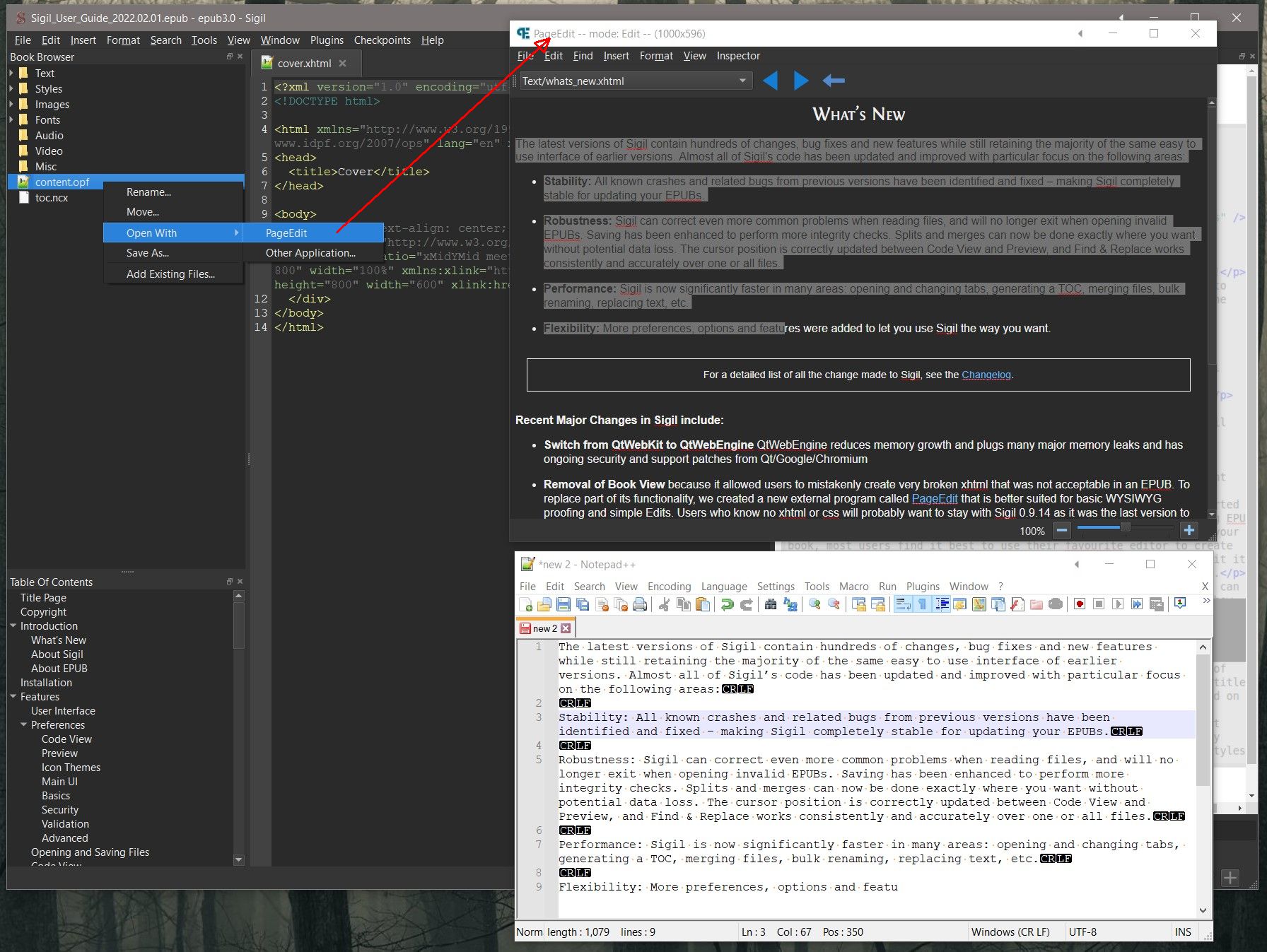 It's a WYSISWYG editor for epubs. IMO the easiest way to use it is via Sigil's Book Browser->Open With on the opf file - The following shows copying text from the EPUB to Notepad++. Select text with Shift, Ctrl and arrow keys - Ctrl+C to copy, paste wherever with Ctrl+V. Works the other way too, i.e. copying text from elsewhere into the EPUB, if you're doing this I suggest you don't use Dark mode in PageEdit, there's a setting in its Preferences. BR |