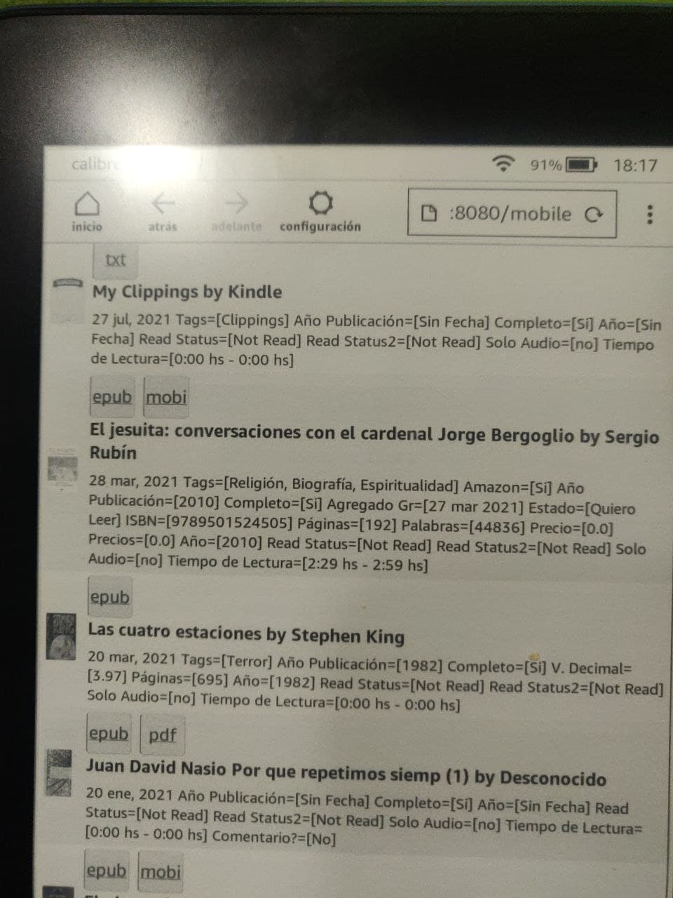 In the first tab we see the address of our Library in Calibre. We have to be careful to check this box to start content server when starting Calibre. This works by being connected to the same Wi-Fi network. In the kindle experimental browser there you must put the address of the content server in this way: http://XXX.XXX.X.XX:8080/mobile Trying to have calibre files converted from mobi to download to Kindle |