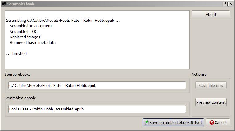 N.B: This plugin has been sanctioned by the MR Moderator Team who were instrumental in setting the rules about what must be scrambled and what can remain intact for upload to be permissible. The rules are subject to change if circumstances change. Background: No-one likes to see an MR member, especially a brand-new member, being issued with a severe warning from a Moderator because they uploaded a copyrighted book to the forum due to ignorance and desperation for help rather than malicious intent. In addition, I have seen the frustration which can occur on both sides, when a knowledgeable user tries to talk a novice user through the non-trivial process of creating a short extract of their problematic book which won't fall foul of MR copyright considerations. Anyone interested can read more in this thread Scrambling copyright ebooks to help troubleshoot problems ??? . How to install: Preferences - Get plugins to enhance calibre Select Scramble Ebook then press Install Configuration: None How to use: Spoiler: