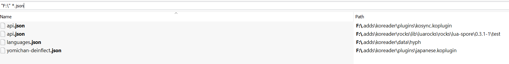 This is what I just tried: 1. Settings>Calibre UNCHECK "store metadata in cache" 2. Exit KOReader 3. Connect to my PC via USB, delete calibre.metadata. 4. Open Calibre, after it finished updating, select "update chached metadata on device." 5. Eject device. Open KOReader 6. Manage libraries>"rescan disk for calibre libraries" - found 1 calibre library with 852 books (the correct number of books actually on the device) 7. Check list of authors - all "zero book" authors still there. One thing I'm curious about - you mention a "pristine json file". When I do a search of the device for *.json, there are 4 results listed, as shown in the screenshot. None appear to have anything to do with Calibre? Last edited by Uncle Robin; 05-20-2022 at 03:26 PM. |