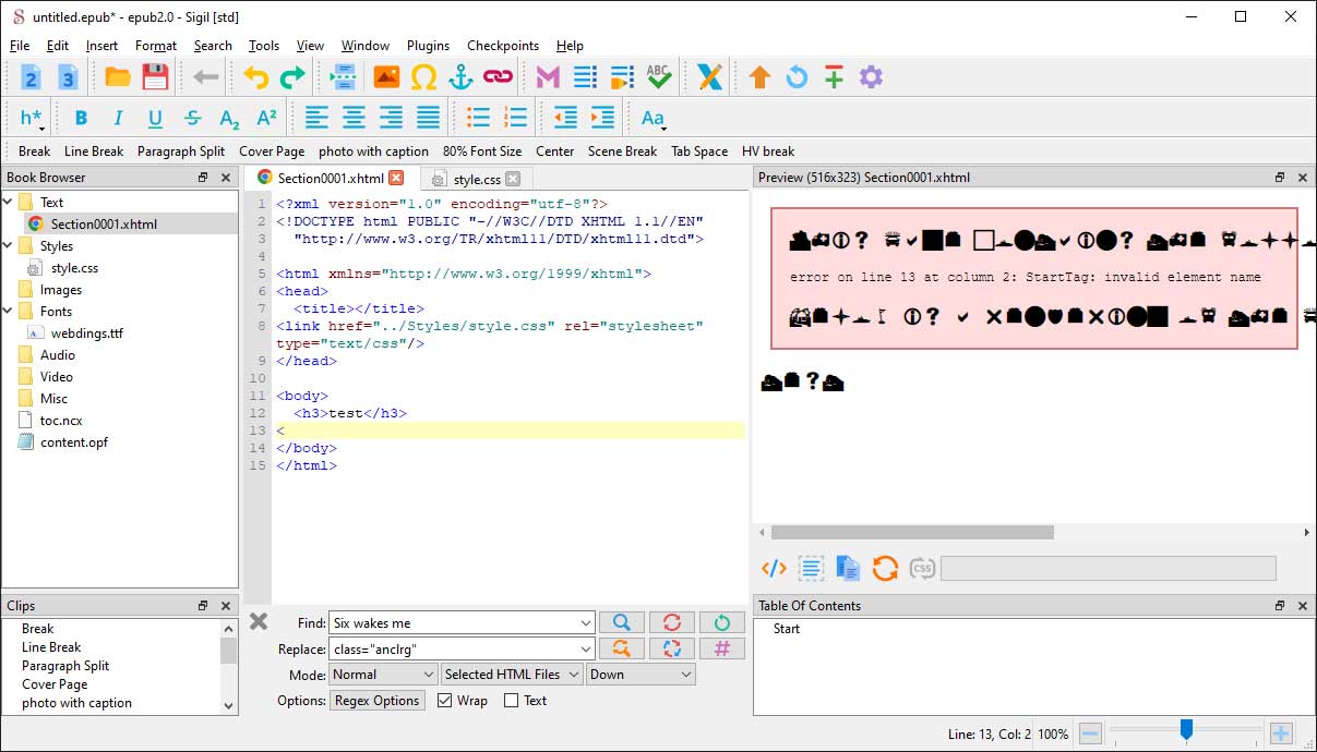 From time to time, I'll be editing an ebook that uses a custom font for chapter headers (<h2>). Because the error message in the Preview pane respects linked styles, the error header (and presumably the body text if that is styled) will be presented using the defined styles from the linked sheet. Normally, this'll just mean an amusingly themed error heading, but in some cases it can make the error header illegible. The instance that prompted me to post this is an ebook I'm editing that uses alien number glyphs as chapter headers. See attached for a sanitized example. I know it's not a big deal but it seems like it ought to be a pretty quick improvement - the error headers and body text could just override the font-family style. As a bonus, it'd be nice if they could word wrap, but that's not as big an issue in my opinion. In any case, Sigil is great - keep up the good work, devs! |