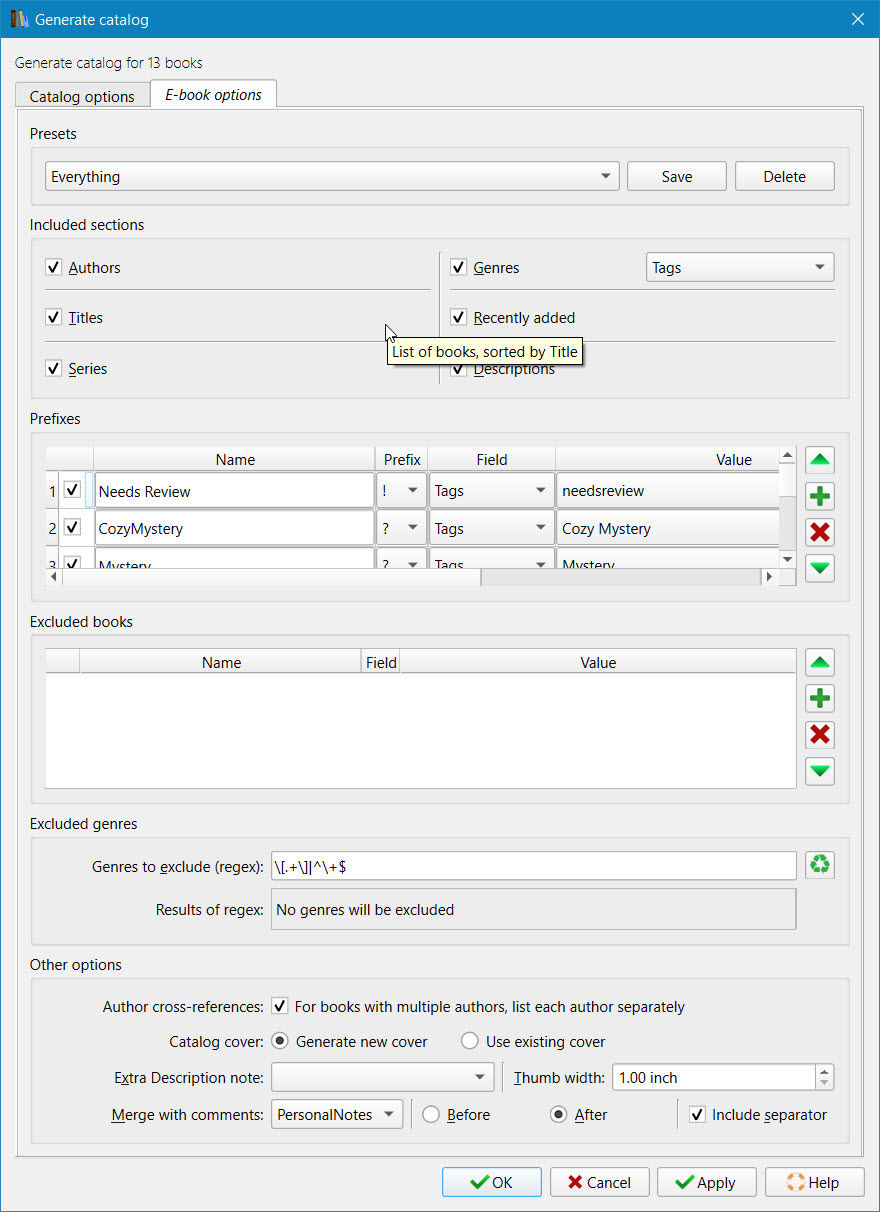 1) both screens show 13 books. Would be interesting to see the list of books in the title section of the table of content. Perhaps you like to add a screenshot 2) is there any reason why the book is not added to the device? For sure it should be in the catalog anyhow, also calibre do not know which books are on which device when it is unplugged. The only specific I can see, is the date. The book is from yeasterday. 3) when you run the catalog creation, do you use any marking/selection or search/filter or virtual library? |