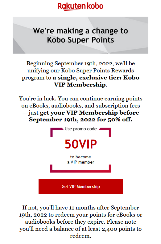 I received an email from Kobo that the Super Points program is changing. If you have Super Points and wish to continue earning and using them, you will need to purchase a VIP membership by 2022-Sep-19. Otherwise, you will no longer earn points and will need to use your existing points by 2023-Aug-19. They are offering a code 50VIP to save 50% on the cost of the VIP membership.