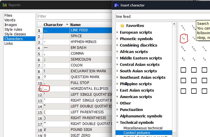 I do not use the edit-tool "Reports" that often, but today I noticed (see attachment) that with TAB "Characters" the "ellipsis" was displayed for "Line Feed", so there appears to be 2 kind of ellipsis's present. Is there a reason for not using the real "line feed" character (for instance as pictured right)? |