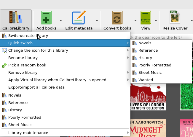 There is one minor glitch in this symlink workaround. When you initially start up Calibre, it indeed opens the desired library now. And you can see in the first attached screenshot below that all the libraries have their correct names (I have more libraries than just "Novels" and "Reference", but I only mentioned those two earlier to make things simpler). But once I choose a different library - Calibre successfully changes to that other library - then you can see in the Quick Switch listing that your current library has taken on the name of "CalibreLibrary" rather than it's true name. As you switch between other libraries, the "CalibreLibrary" moniker moves around to point to the current library (and the original name of the previous library is restored). This is a minor glitch that I can live with. It's easy to tell which library I am in just by looking at the book covers. Thanks for your help! Last edited by haertig; 11-19-2022 at 09:20 PM. |