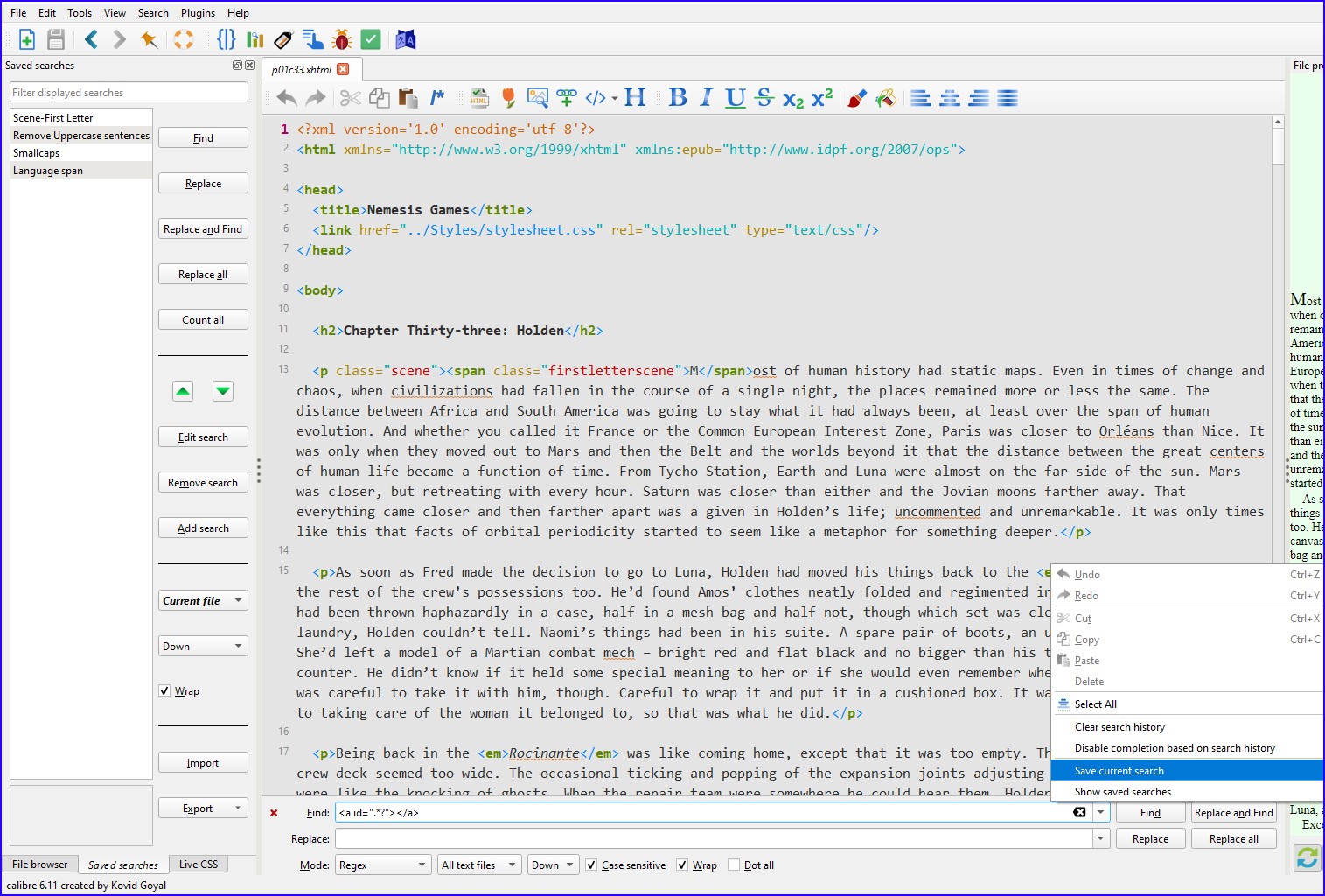Does the Calibre editor have any means of saving and applying such a set of edits. They're both regex and non-regex replaces across all text files in the book. |