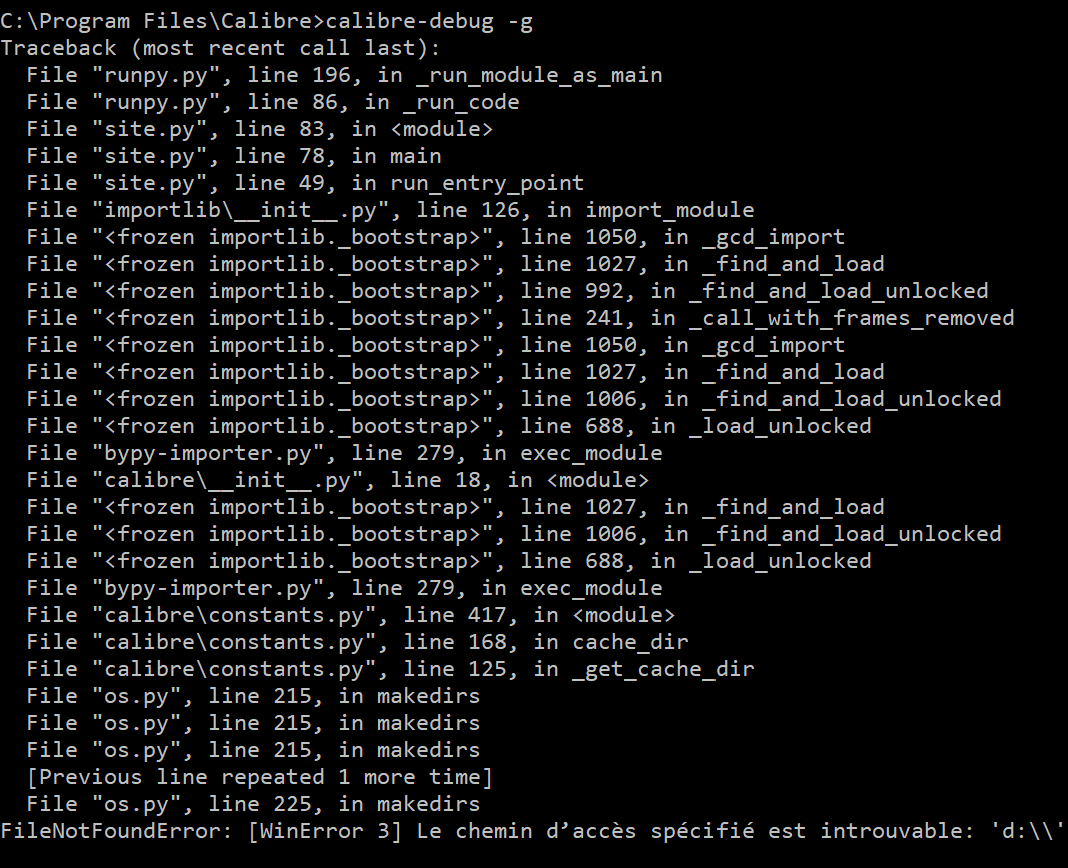 I have a strange problem. I'm a long time user, but I can't see how to solve this issue. I'm running Calibre on a very small server, with an external usb drive "d:". Recently the drive stopped working and I just removed it. I wanted to change the location of the Calibre Library, but Calibre refused to run. I was surprised. I was expecting an error message, but nothing. I uninstalled Calibre, and re-installed it. Same issue. I then try the debug feature, and the result is attached. The process ends on a File not found error: [Win error 3] Path not found: 'd:\\' Please note the d: I don't know what to do. Is there a registry entry than can cause this problem ? Thanks Gaston |