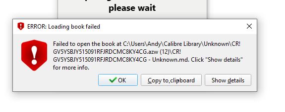 Can anyone help or lead into a direction to understand what is going on? Thanks, Andy calibre, version 6.13.0 ERROR: Loading book failed: Failed to open the book at C:\Users\Andy\Calibre Library\Unknown\CR!GV5YSBJY515091RFJRDCMC8KY4CG.az w (12)\CR!GV5YSBJY515091RFJRDCMC8KY4CG - Unknown.md. Click "Show details" for more info. Failed to convert book: C:\Users\Andy\Calibre Library\Unknown\CR!GV5YSBJY515091RFJRDCMC8KY4CG.az w (12)\CR!GV5YSBJY515091RFJRDCMC8KY4CG - Unknown.md with error: InputFormatPlugin: TXT Input running on C:\Users\Andy\Calibre Library\Unknown\CR!GV5YSBJY515091RFJRDCMC8KY4CG.az w (12)\CR!GV5YSBJY515091RFJRDCMC8KY4CG - Unknown.md File extension indicates particular formatting. Forcing formatting type to: markdown Language not specified Creator not specified Building file list... IgnoreFile('Could not read from file: C:\\Users\\Andy\\AppData\\Local\\calibre-cache\\ev2\\t\\c0-kmfyivfu\\"��H�I eGpl� \x17���ֱ=0\x0e�ڂ�g���r�\x10K�ت���w6 with error: [Errno 22] Invalid argument: \'C:\\\\Users\\\\Andy\\\\AppData\\\\Local\\\\calib re-cache\\\\ev2\\\\t\\\\c0-kmfyivfu\\\\"��H�I eGpl� \\x17���ֱ=0\\x0e�ڂ�g���r�\\x10K�ت���w6\'') IgnoreFile('Could not read from file: C:\\Users\\Andy\\AppData\\Local\\calibre-cache\\ev2\\t\\c0-kmfyivfu\\�H�� ����\x15���E�N�\x07\x07�5MQ\'3Yb�Ժ�.\u07be��r��֭Z5 58��XZK�� with error: [Errno 22] Invalid argument: "C:\\\\Users\\\\Andy\\\\AppData\\\\Local\\\\calibr e-cache\\\\ev2\\\\t\\\\c0-kmfyivfu\\\\�H�� ����\\x15���E�N�\\x07\\x07�5MQ\'3Yb�Ժ�.\\u07be��r� �֭Z558��XZK��"') Failed to run pipe worker with command: from calibre.srv.render_book import viewer_main; viewer_main() Traceback (most recent call last): File "runpy.py", line 196, in _run_module_as_main File "runpy.py", line 86, in _run_code File "site.py", line 83, in <module> File "site.py", line 78, in main File "site.py", line 50, in run_entry_point File "calibre\utils\ipc\worker.py", line 196, in main File "<string>", line 1, in <module> File "calibre\srv\render_book.py", line 821, in viewer_main File "calibre\srv\render_book.py", line 812, in render_for_viewer File "calibre\srv\render_book.py", line 789, in render File "calibre\ebooks\oeb\iterator\book.py", line 62, in extract_book File "calibre\customize\conversion.py", line 242, in __call__ File "calibre\ebooks\conversion\plugins\txt_input.p y", line 310, in convert File "calibre\ebooks\conversion\plugins\html_input. py", line 90, in convert File "calibre\ebooks\conversion\plugins\html_input. py", line 153, in create_oebbook File "calibre\ebooks\html\input.py", line 287, in get_filelist File "calibre\ebooks\html\input.py", line 265, in traverse File "calibre\ebooks\html\input.py", line 109, in __init__ ValueError: embedded null character |