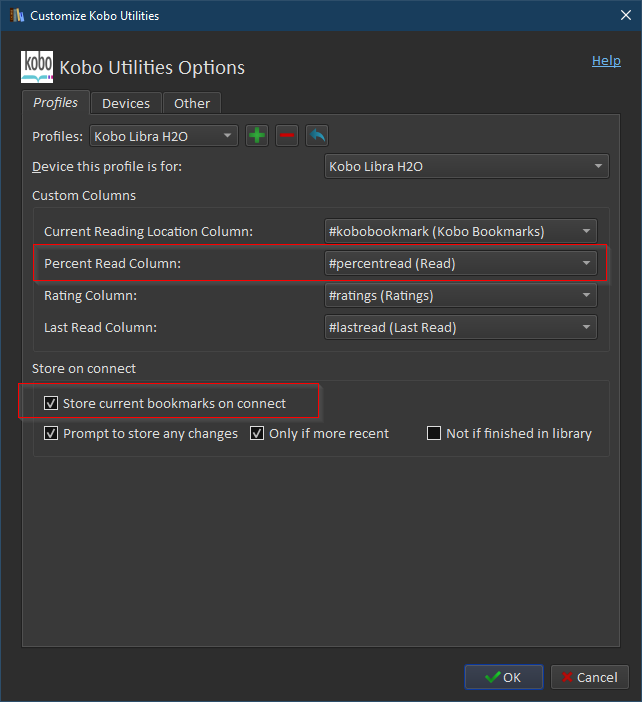 Create a new integer-type column, #percentread. I suggest {0}% for format. You may want to set the default value to 0. Install Kobo Utilities plugin. Here's the settings. Once it's set up, you can then put this template in a 'column built from other columns' to turn it into read statuses. Code: