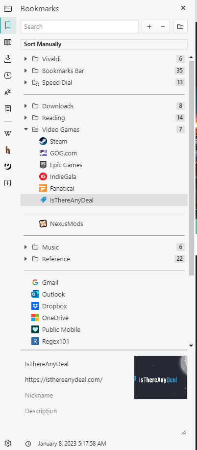Then I was a Firefox user for several years but finally got sick them dropping features that I was using. (I mean the notes field in the bookmark list, why on Earth did they have to drop that? Was I really the only person who'd spent years curating a list of bookmarks with notes?) And then I found Vivaldi - initially attracted by its links back to Opera (and it's ability to have notes on bookmarks). There were some moments early on when I was inspired to look around for other options, but I kept coming up empty and Vivaldi kept getting better. Now I am very happy with it. It's based on Chromium so site compatibility is good, and the developers give me confidence that they take privacy seriously which is even better. I don't like the integrated email very much, but it's entirely optional - I have it active for my free Vivaldi account only and it suffices for that. In that vein, Vivaldi has lots of interesting and useful features which you can use or ignore as you like, and it seems to be compatible with most Chrome/Chromium extensions (or the few I've tried so far, I don't tend to need many because Vivaldi comes with the most critical stuff built in). Last edited by gmw; 03-16-2023 at 11:48 AM. |