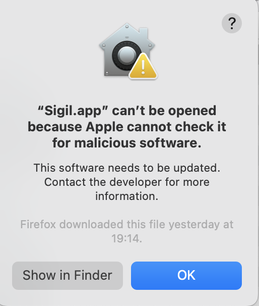I just downloaded Sigil and go this message that the app can't be opened. I.m on a MacBok Pro with OSX Monterey 12.6.3
