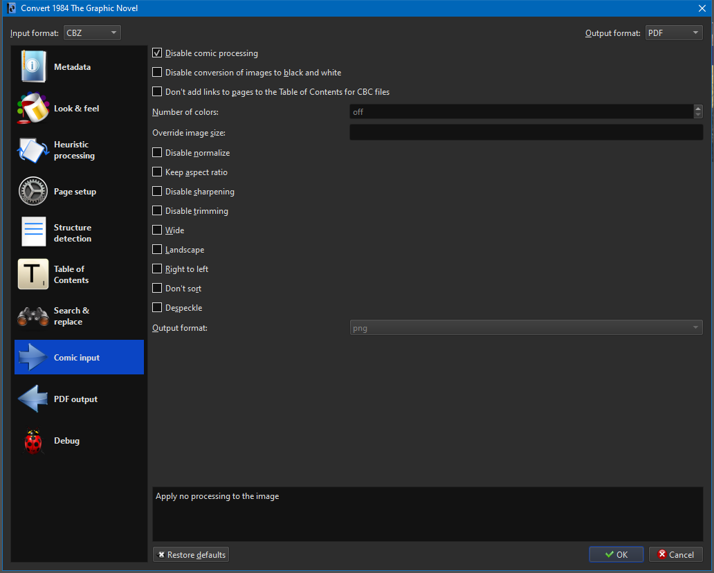thanks for your answer. Obviously I'm not reading all the books I put in Calibre, now I'm just creating a comic book library for my son. By the way, can I ask you for information? I have to insert several .cbz books that contain .png black & white images and a .jpg color cover and convert them to .pdf format, but all the time the cover is changed to black & white. I searched everywhere but I did not find a solution, do you know how I can do? All settings are the default. Thank you. |