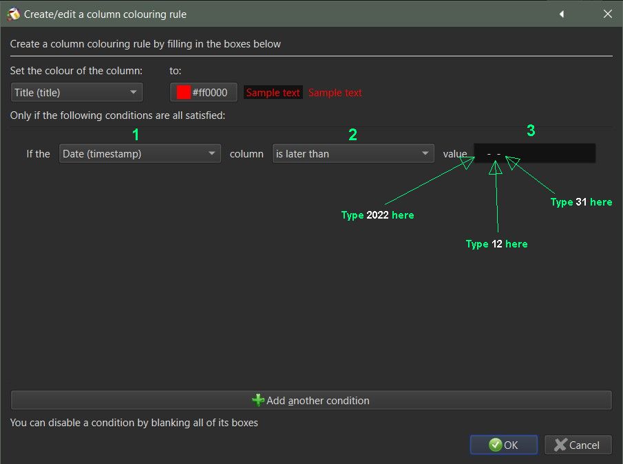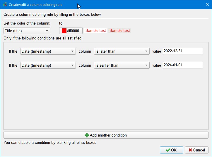 Pay special attention to the two lines starting with Date (timestamp) after the line that says Only if the following conditions are all satisfied. The first conditions says if the date is after 2022-12-31, the second condition says if the date is before 2024-01-01. So basically, if the date is from 2023-01-01 to 2023-12-31, the column will get the colour. Last edited by DNSB; 06-23-2023 at 11:07 PM. |