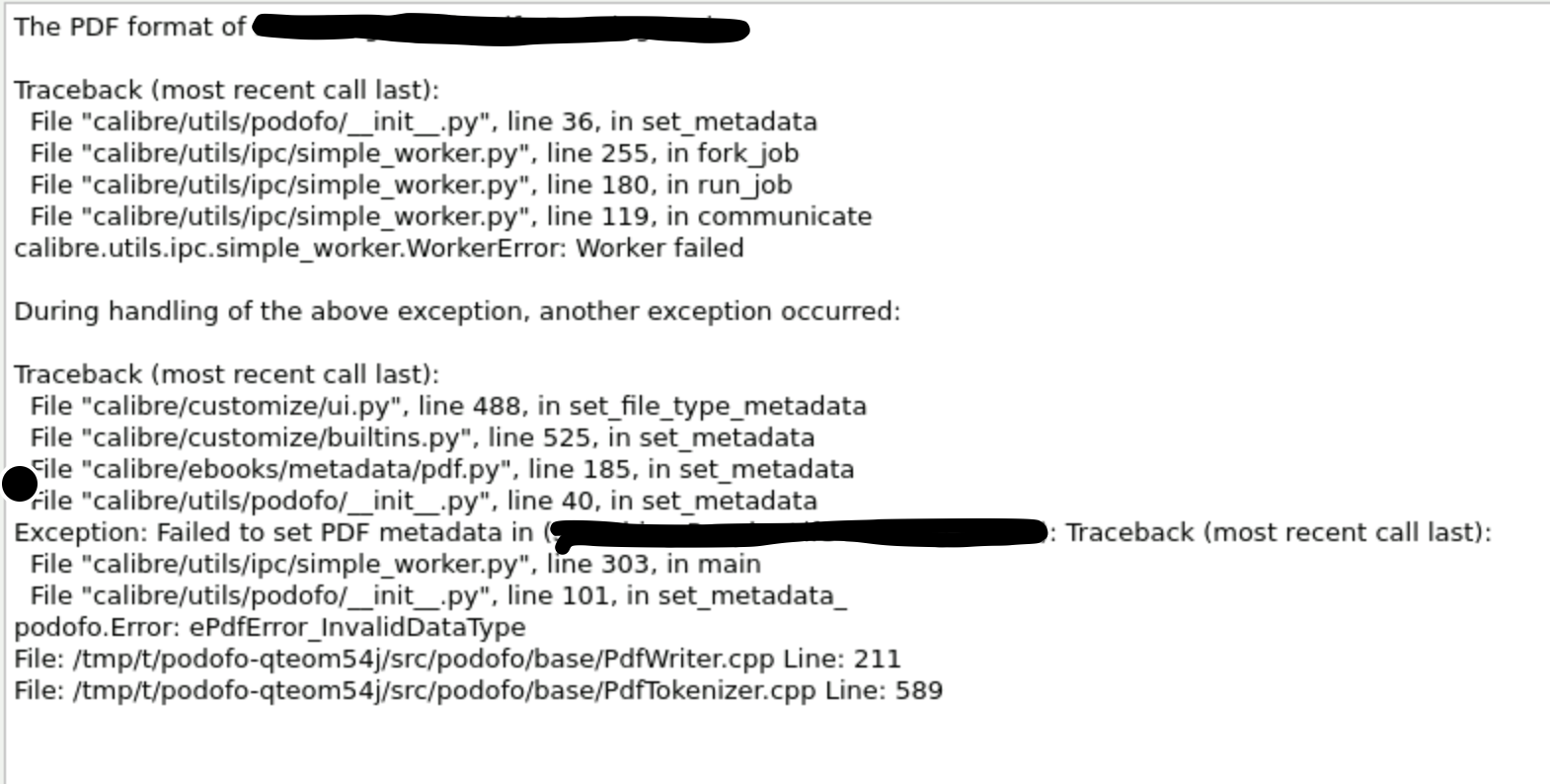 I'm trying to embed metadata to all ebook, but get some errors with PDF files only: (this is screenshot as I run it on docker) Is this a limitation of the PDF format, a calibre limitation ? Thanks |