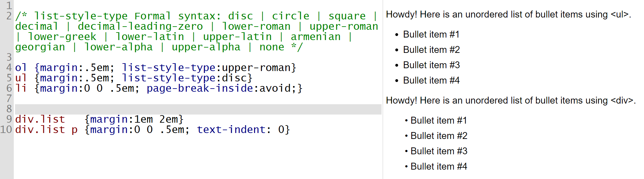 ) parse the document properly. For example, I used the following css on a style sheet to make a list of paragraphs look just like the unordered list. (see attachment) Code: