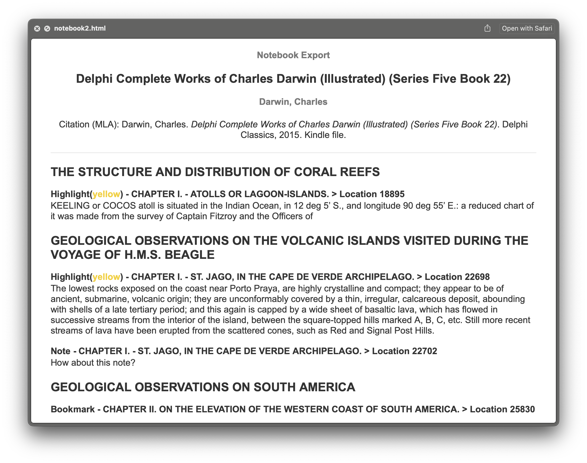 I would just open with Word (or anything that imports HTML) and spend a few minutes editing it. With some scripting skills you could probably automate edit of the HTML since it has consistent structure/tagging. I've never used KindleMate (it is Windows only), but it relies on the Clippings file, which does not log chapter headings at all (nor does direct export from Kindle). I assume that's why you are using the Kindle app export. Last edited by tomsem; 10-20-2023 at 04:55 PM. |