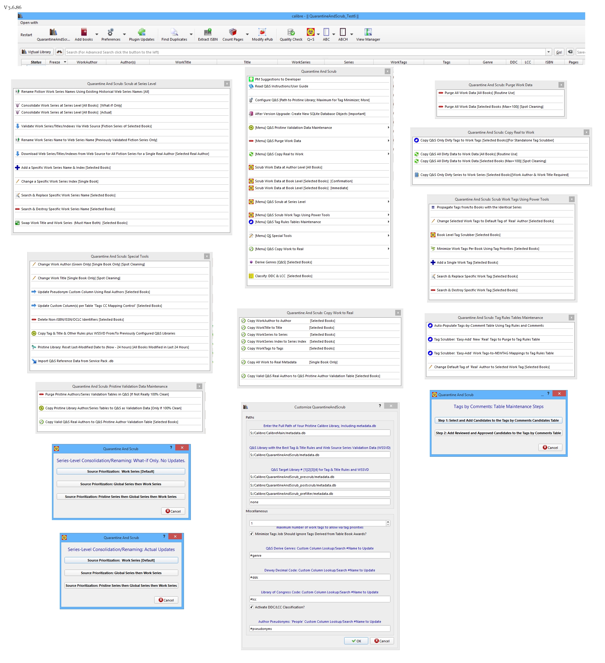 Version 3.6.115 - 23 January 2021 Fictiondb.com as a source of Web Source Series Validation Data (WSSVD) replaced. New menu item: Download Web Series, Indexes, LCCN, ISBN, PermaLinks, Tags, Publisher, PubDate [Selected Single Real Author] The primary purpose of this is to add new WSSVD to Q&S. Extra metadata is a "gift", and totally secondary to the primary purpose. The new ability to create "empty books" with full metadata for a single author's books NOT currently in Q&S is a bonus as well. Also, several menu selections have had their item names improved to clarify their use and dependencies, if any.