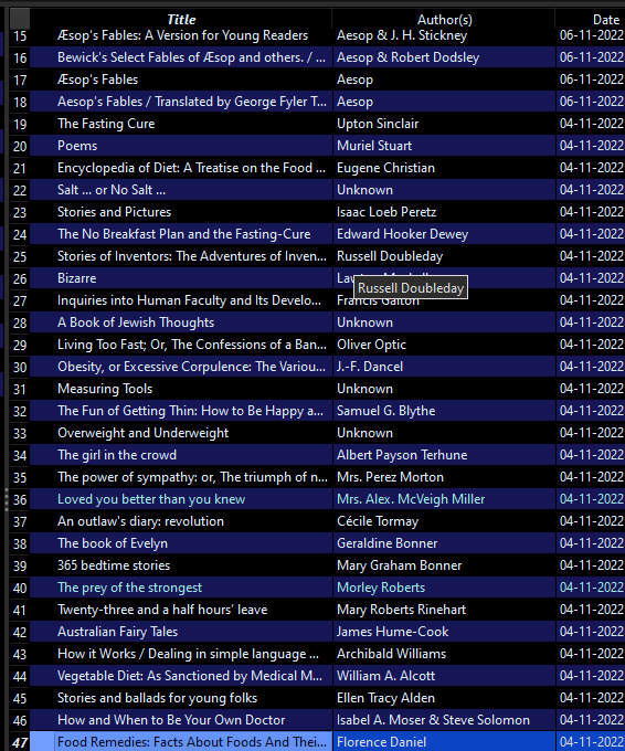 ![]() So, in order to have a dark theme, I am using the Job Spy plugin, currently 1.0.239. Among other things, it allows picking specific colors (BG1 and BG2) for the library view background. The problem with Job Spy is that it has many BG-colors to pick from, but they are all way to light. I am using this pluging for a long time now, but only to put both BG1 and BG2 to 'black', which seems to be the only way to have a non-disturbing dark background. Alas, this implies that I can't have alternating background colors. Can ayone help me out here? Is there another way? TIA. (Calibre 6.29 on Win10) Last edited by DVdm; 11-09-2023 at 12:07 PM. |