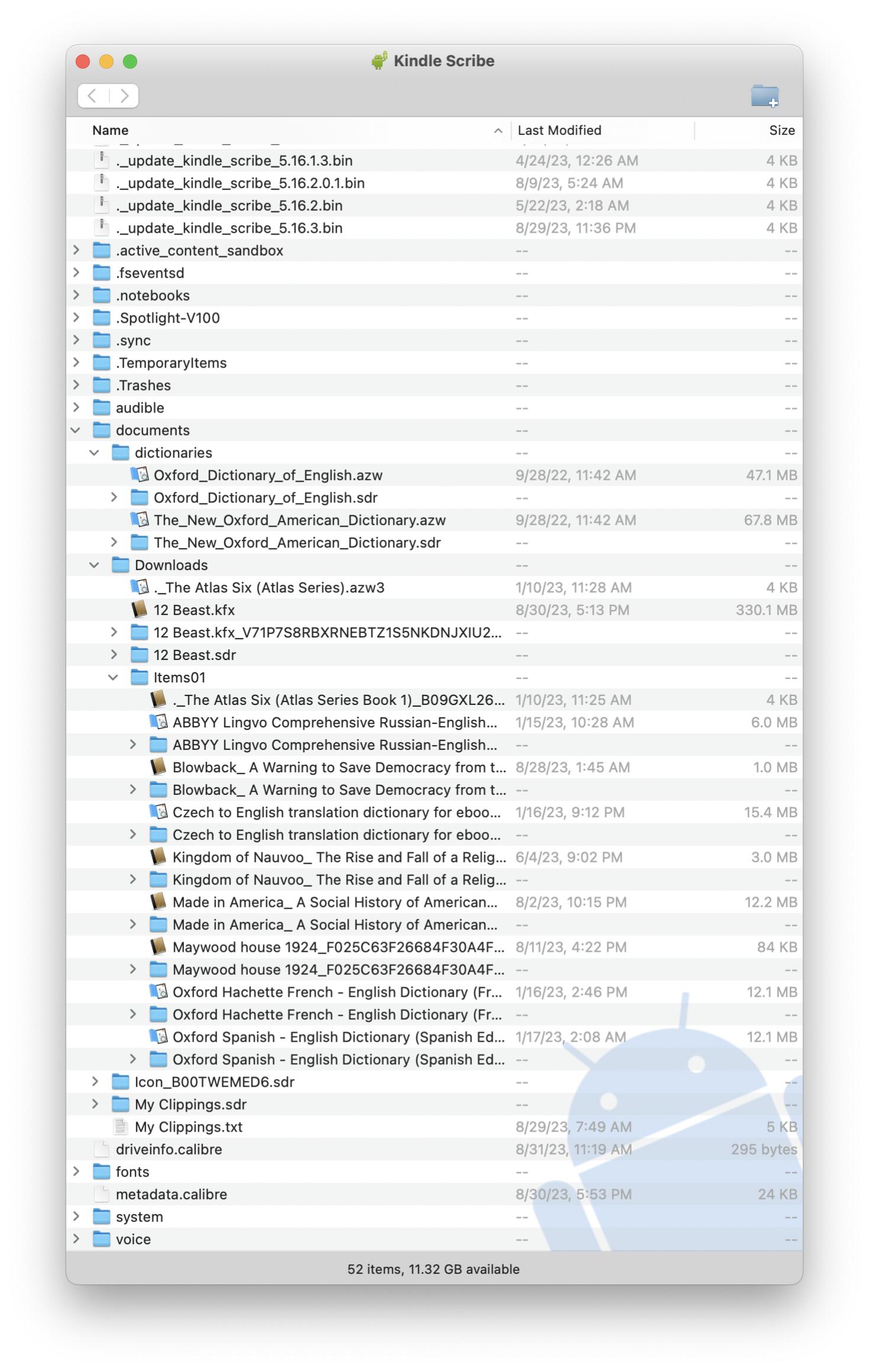 Disconnect is done by tapping Disconnect on the Scribe. Calibre evidently knows MTP, so it still connects and shows content, is able to Send to device, etc. However, calibre Show books now displays items which are normally filtered out (by calibre?) or hidden with '.' filename prefix on an emulated FAT32 partition. (see screenshot). Matching to In Library does not always work correctly because of this (see '.Anna Karenina'). Also some .kfx content inside of .sdr folders, html files in /System folder, readme in /fonts folder etc.. Of course undocumented ebook-device command line tool does not work with Scribe. Kindle 10th and 11th generation also got this update, but still mount to file system as before. Without knowing Amazon's motivation for making this change, it seems as likely as not that they might get this 'feature' in the future. So some sort of fix is needed for Scribe. I will be happy to provide more information if any is needed. Thanks. Last edited by tomsem; 08-31-2023 at 04:06 PM. |