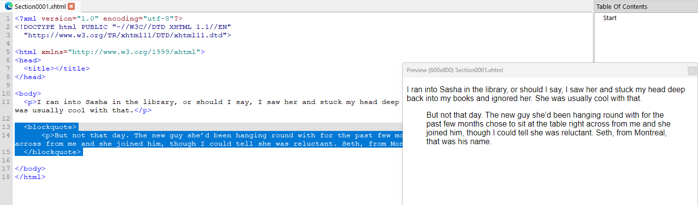 And to answer your previous question: no, there's no way to customize/tweak the Prettify feature. The only thing you might be able to do is use an external editor that will format the code the way you want it and then don't use Sigil's Prettify. Last edited by DiapDealer; 01-11-2024 at 07:25 PM. |