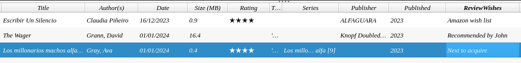 From preference add your custom column. You should always have the books on your Amazon wish list uploaded to Caliber, whether they are epub or uploaded through isnb (add books by isbn). And in the column that I suggest you add: Amazon Wishes, Recommended by xxx, Interesting read |