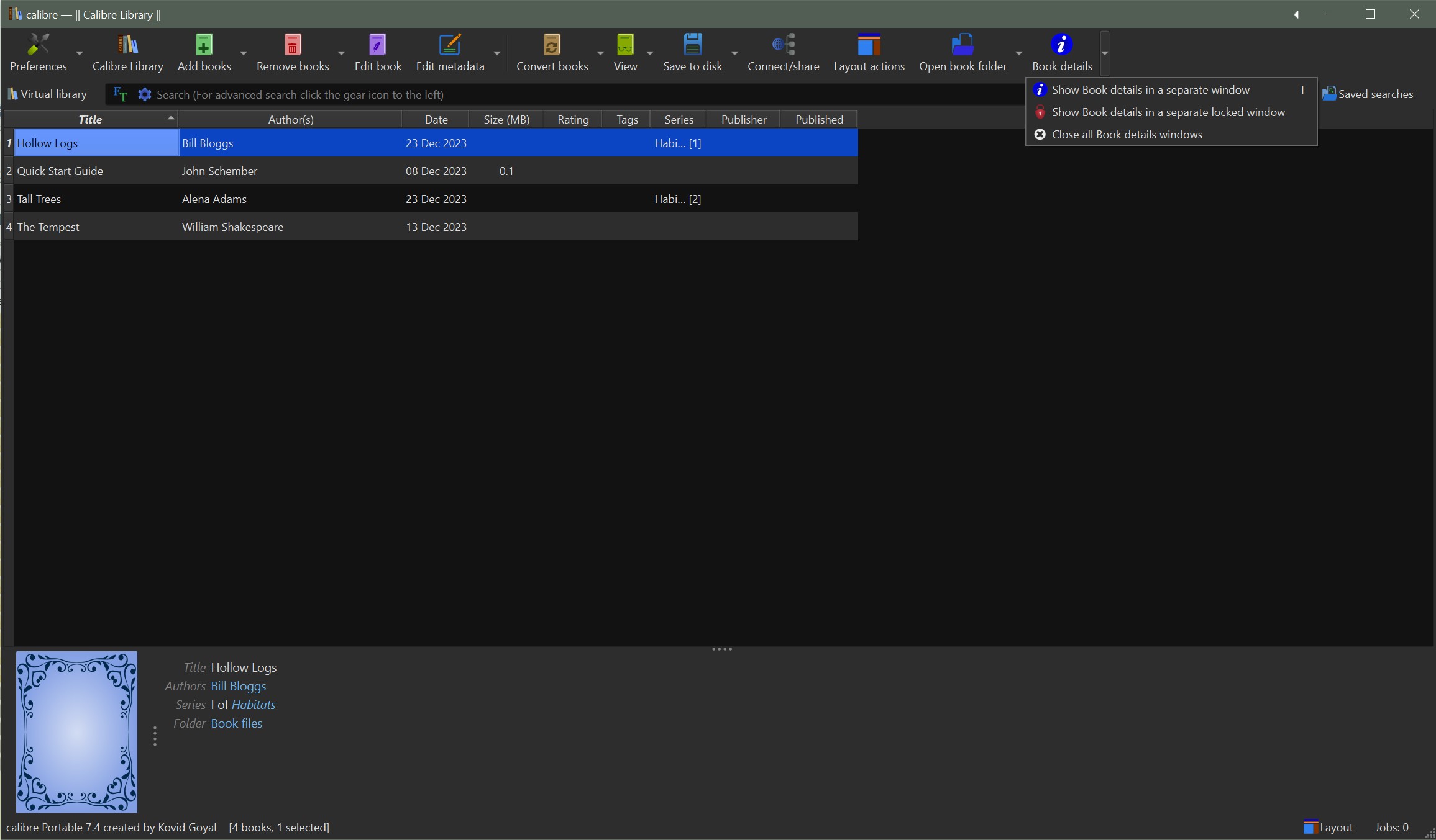 I set my book details to be below the main database as this is easy to see for each book as I scroll down. The comments used to be to the side of the other book details but are now below which means I have to scroll. The last change log for Release: 7.4 [19 Jan, 2024] notes under Bug fixes: