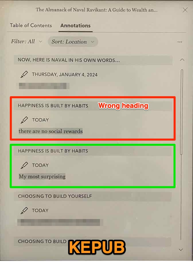 This seems to be happening with books which, within the same HTML/XHTML content files, have multiple headings that are listed in the table of contents. The bug occurs when a highlight is made in a "page" where a section ends and another one begins. It occurs in in EPUB and KEPUB files (including purchased from Kobo), but there are differences in how the bug manifests itself. I have attached photos showing the bug in EPUB and KEPUB files. Steps to reproduce: I will describe the bug using the book "The Almanack of Naval Ravikant". The EPUB is distributed for free on its official website. I'll use a chapter in this book is called "Learning Happiness", with various sections, each starting with a heading. An example of two consecutive sections are "Envy Is the Enemy of Happiness" and "Happiness It Built by Habits". I'll start with the EPUB file: