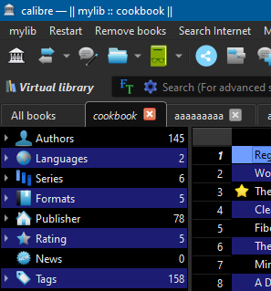 You'd need to click Virtual library, select "Show Virtual libraries as tabs", as a first step. Then create a VL for cookbooks, for instance, by clicking Virtual Libraries button again, then "Create" -> Fill in VL name -> fill in search expression, e.g. tag:cookbook The View Manager plugin allows choosing what columns you want displayed - I'm assuming you're talking book list view, not cover grid mode. |