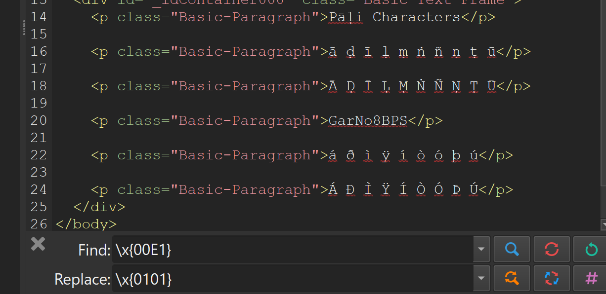 In the page that you saw in the capture, but top two lines of diacrits used TNR in the InDesign Document where ā is 0101, the now standard place for ā. The lower two lines were in GaramondNo8BPS a very old font-family where the codes of the diacrits were not standard codes. ā is place at code 00E1. I dont know if this answers your confusion, Kevin. It would be helpful to be able to used the Sigil Regex find/replace to use Find: \x{00E1} Replace: \x{0101} in the same way that I do in InDesign. But as I said at this beginning, this is NOT a big issue for me. It's more a matter of just wanting to know what I am doing wrong with the Regex search and replace using HEX char strings. |