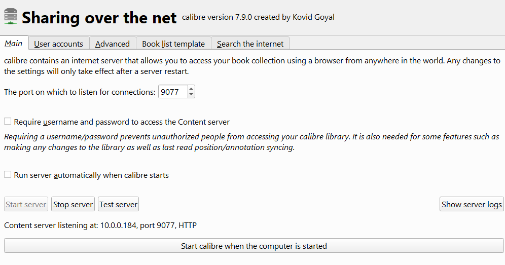 Yes. Go to the menu at the top of the screen in Calibre. Click on CONNECT/SHARE. When the drop-down opens, select START CONTENT SERVER. Calibre will take you back to the menu. Click CONNECT/SHARE again, & you will see a selection to STOP CONTENT SERVER. Directly to the right of that, you will see the server address. I wish there was a way to paste an image here. It would make things so much easier! I think I've given you the information you need to find the address. Let me know if it works for you. Good luck! |