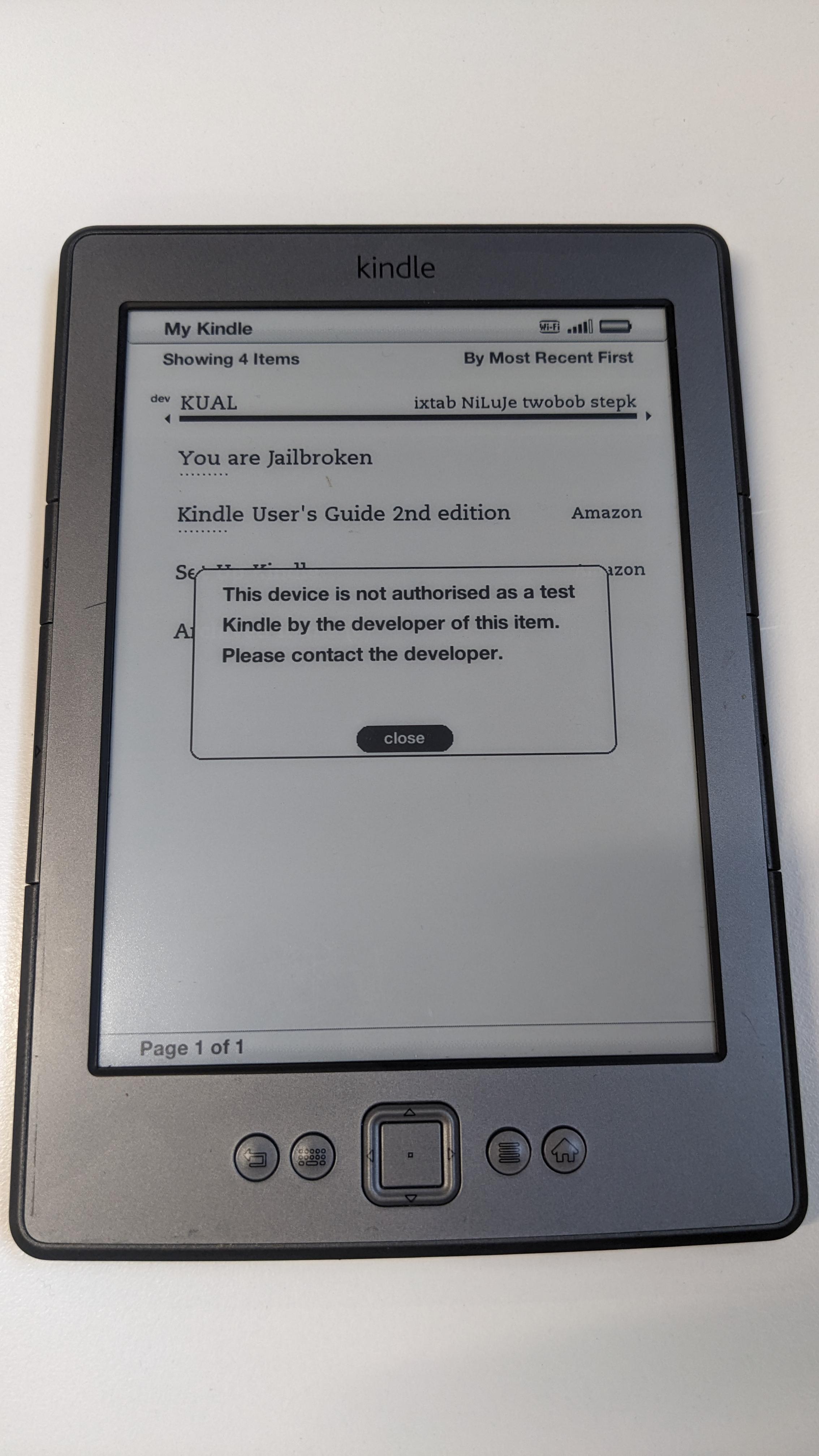 Testing with just the K4jailbreak and KUAL installed, I only get the error when connected to Wifi. I also get a new 'book' showing after connecting to wifi "Test Kindle Installation Result". As mentioned, the error I get when opening KUAL is: "This device is not authorized as a test kindle by the developer of this item. Please contact the developer." The error still occurs after disconnecting Wifi, so it seems that on connecting wifi, its changing something that doesnt allow KUAL to open. I get the error even when I connect to wifi, before installing the jailbreak and KUAL. Without having connected to Wifi, I can open KUAL as normal. |