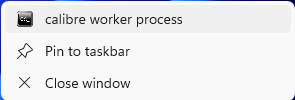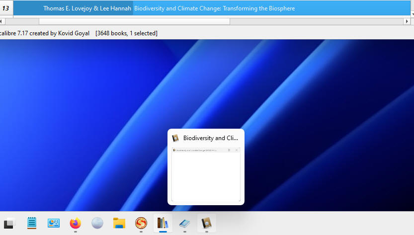 Both Adobe programs open fully but not book loads nor can be added from the program. I'll attach a screen shot of what happens with Calibre's viewer. It does not open fully. The icon can be seen on the task bar and if the mouse is held over it a tiny window will pop up. The title of the book shows but otherwise it is blank. Clicking on it does nothing. Right clicking brings up menu with message "Calibre worker progress". If I click on that there is a flash but it does not open. |