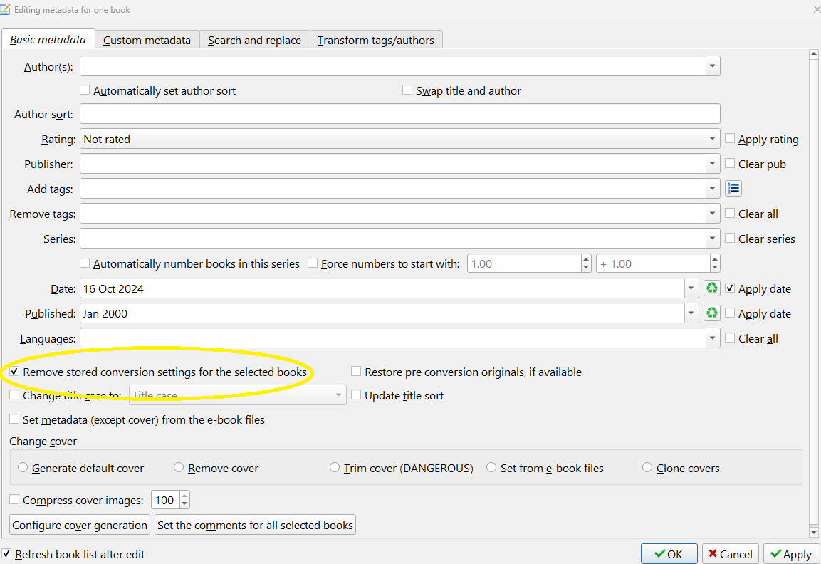 Also please use the Paperclip tool or Attach files option instead of using 3rd parties to store images. Many sites now block other sites from accessing those images. Also note that if you have previously converted a file, you will need to use the Edit metadata in bulk tool and check Remove stored conversion settings for selected books to remove the saved conversion settings. Last edited by DNSB; 10-23-2024 at 04:37 PM. |