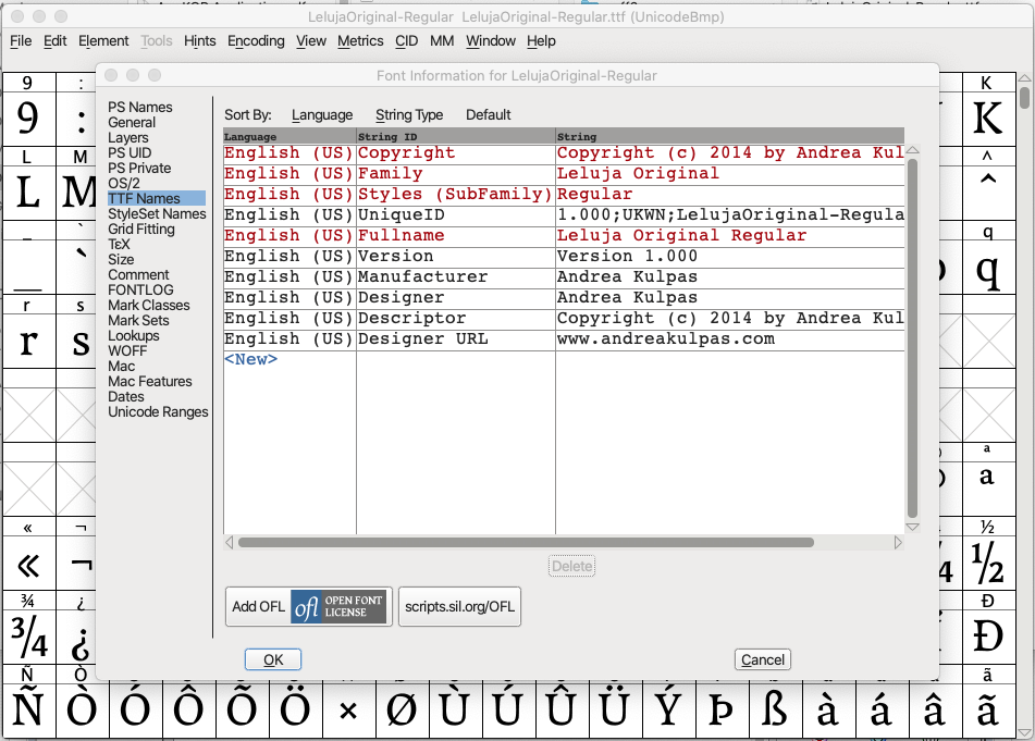 I should also add that I am posting the original font metadata in the FontForge screenshots. These are not my modified files because I just got frustrated and deleted them.