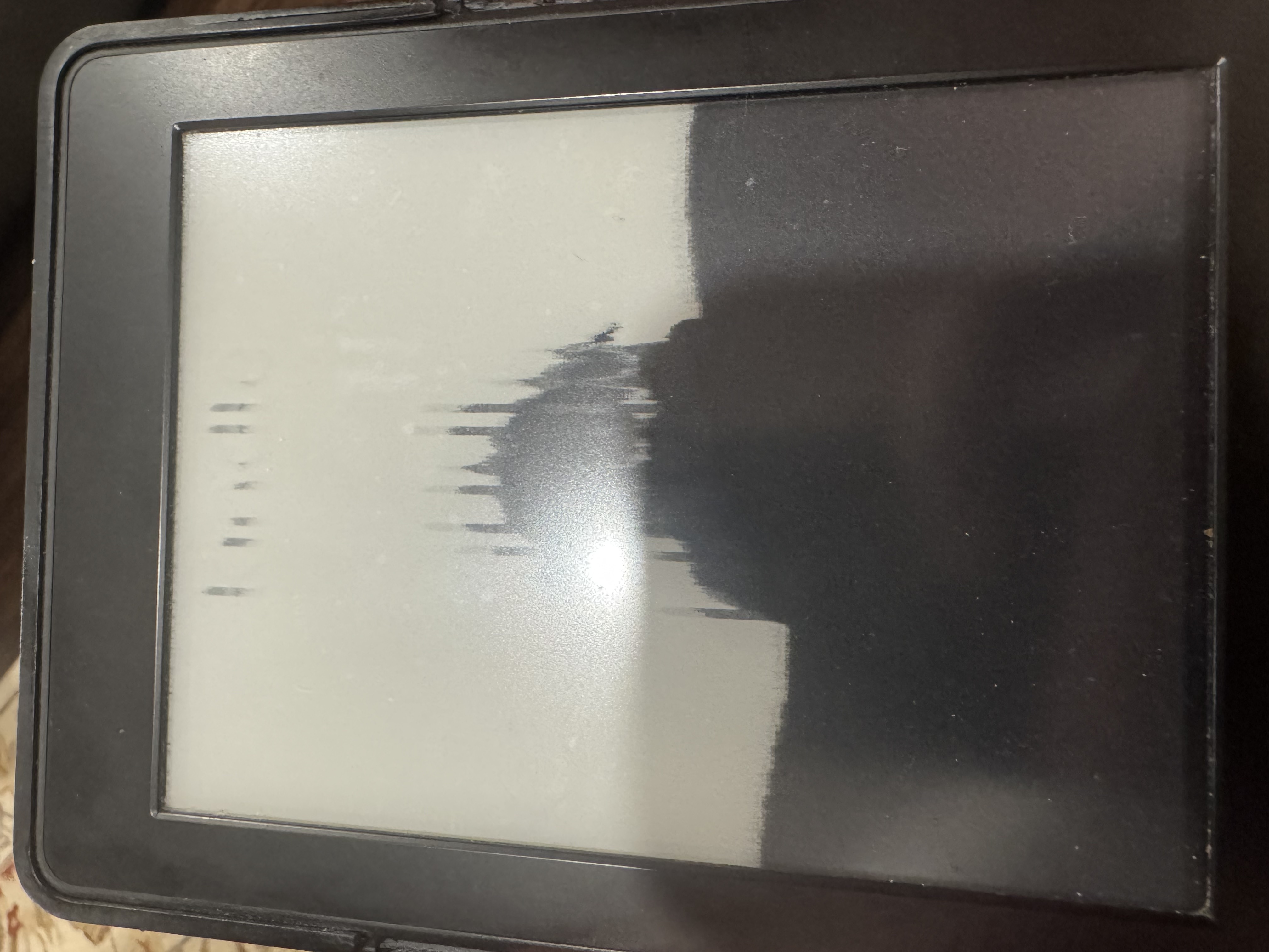 My Kindle PW1 display is acting up. I've attached pictures. At first I thought the display was broken, but after a reboot it worked fine until I plugged it into my Macbook to transfer some books. Now when I do a forced reboot by holding the power button it does a full screen refresh (a few full black and then full white flashes) and then shows the startup screen just briefly before it goes wonky again. This appears to be a software issue, but I'm not sure what, nor why it worked briefly.