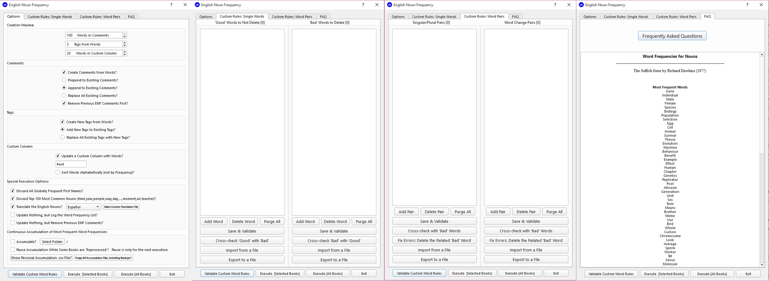 Summary: Determines 'English Noun Frequencies' for words in a particular book's text, and will optionally: