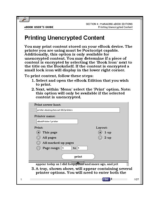 ![]() While the eBook Technologoies, Inc. website Guides don't have anything about this there Section 4: Managing eBook Editions, the ebook counterpart available to all REB1200 owners, as a free download after registering your REB1200, has the info you seek. In particular, on your REB1200, under the General Interest category, open eBook User's Guide Version 4.1 authored by eBook Technologoies, Inc. and turn to page 4. There you will note two new items added to Section 4: Managing eBook Editions, Transferring Personal Content to Your eBook and Printing Unencrypted Content. The latter has instructions to setup a Postscript capable printer with Windows using Internet Information Server (IIS) to make this work. Below I post images of the relevant sections as a quick reference. By the way, I could never get this to work, so if you get it working, please post here what works for you. AND THIS IS NOT AVAILABLE TO THE EBW1150. Last edited by nrapallo; 02-02-2009 at 11:03 PM. |