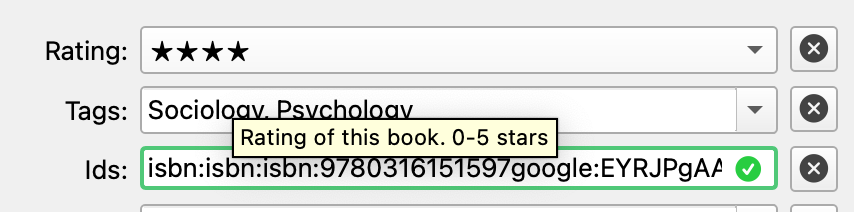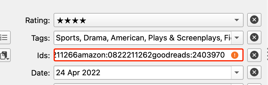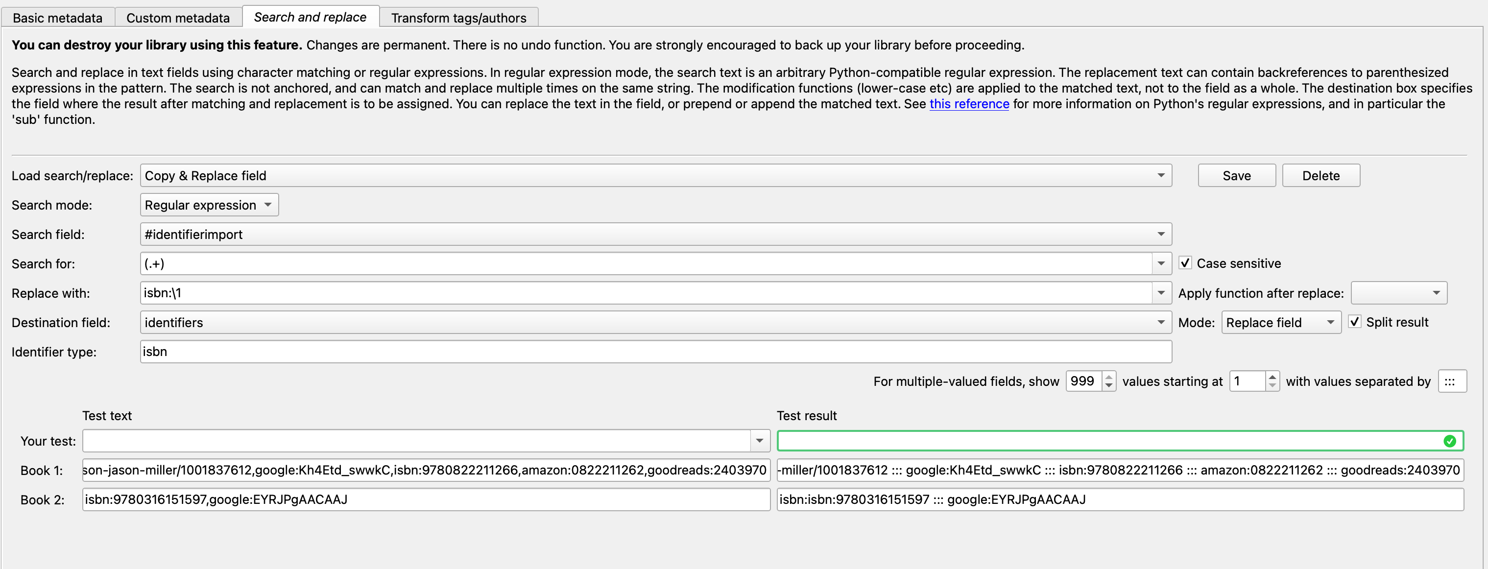 I had used both import list and jobspy before to upload metadata from a csv to a custom field so thought I could plough ahead without a backup of my library. However, it seems that while this is a fairly easy process for custom fields, it is not so easy for standard, in-built, fields like Identifiers. I created a catalog with my ID's so I could work on them outside of calibre, but now I am ready to re-import them, i am stuck. Import list plugin is a no go as it only works with custom fields. Jobspy says it can do it, but i spent half a day getting my csv into what i believe is the correct format - 'type':'value' separated by commas, but I cannot get it to work. I have now imported the ID's to a custom field - #identifierimport - and looking for a way to simply copy the data from this field into the identifier field verbatim. This can be achieved one by one without any problem, but can someone please either tell me how to do this for my entire library or write a REGEX that accomplishes this in the search and replace function. To clarify, I simply want to copy the exact data from a custom column to the Identifier field. I have over 10,000 books and can't face going one by one. Thanks for any help provided. |