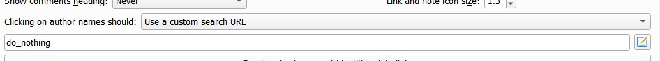 The second disagrees with the first, confuses me, and is not what I see. If in Prefs / L&F / Book details I put the following: Note that the URL is the text "do_nothing. Authors have the link "do_nothing", which shows in the tooltip. When I click on an author, no web page/tab/anything opens. Instead I get the following in my debug log: Quote:
