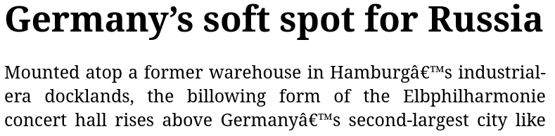 https://unherd.com/feed/ and it works for most articles, but there are some oddities with quote characters. With this story, all quotes render fine: https://unherd.com/2025/03/how-safe-...letby-verdict/ With this one, they are garbled: https://unherd.com/2025/03/germanys-...ot-for-russia/ What would explain this behaviour and what can I do to fix it? |
