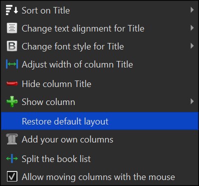 View Manager is per library, so you can have different columns for different libraries, and/or same column with different widths, and also it saves/restores sort columns. There's also the Column header context menu action Restore default layout - not entirely sure what it does, but it may suit you. BR |