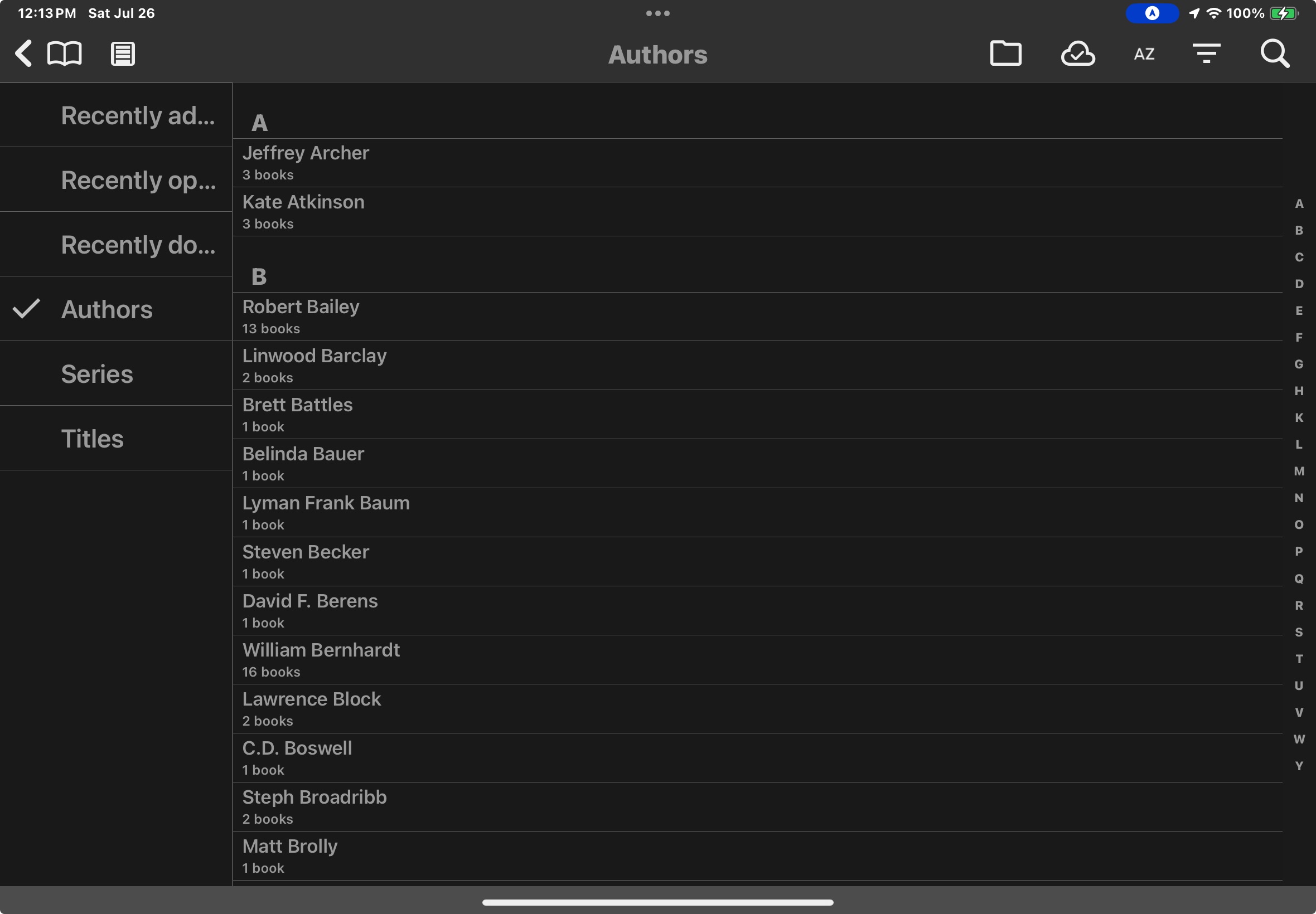 Screenshots to explain what I mean by the way Kybook sorts ebooks. I can select "Authors", and then go to a list of authors. Only after choosing which author to look at do I get a list of books. All the apps I've looked at so far don't do this, tell it to sort by author and it just rearranges the books into alphabetical order by author and you have to scroll through the entire list of books to find the author you want to look at closer.