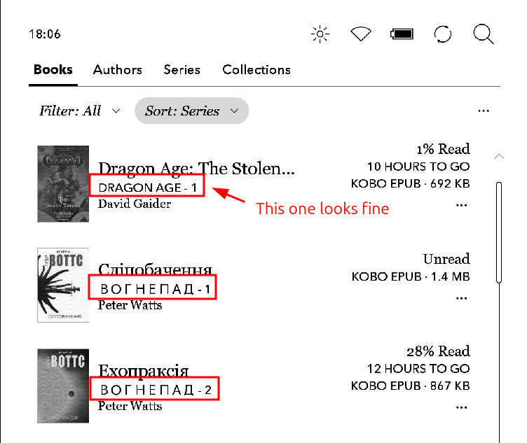 I've tried to change the default system GUI font Avenir (header, footer, series names in My Books tab) to another one with proper Cyrillic support without success. The main reason is that the Ukrainian text looks weird, while the English one looks normal. I've tried it with both KoboPatch (files section) and by replacing fonts manually in KoboRoot.tgz, like described here: https://www.mobileread.com/forums/sh...54&postcount=7 AFAIK, the font names should be changed in font metadata to match the default Avenir ones. Also tested with upgraded Avenir from this post: https://www.mobileread.com/forums/sh...36&postcount=1 Then, I've found the next thread, also without success: https://www.mobileread.com/forums/sh....php?p=4331303 I also tried it with the Ubuntu font family. Here is my snippet from kobopatch.yaml: files: src/adds/fonts/Avenir.ttf: usr/local/Trolltech/QtEmbedded-4.6.2-arm/lib/fonts/Avenir.ttf src/adds/fonts/Avenir-Bold.ttf: usr/local/Trolltech/QtEmbedded-4.6.2-arm/lib/fonts/Avenir-Bold.ttf src/adds/fonts/Avenir-BoldItalic.ttf: usr/local/Trolltech/QtEmbedded-4.6.2-arm/lib/fonts/Avenir-BoldItalic.ttf src/adds/fonts/Avenir-Italic.ttf: usr/local/Trolltech/QtEmbedded-4.6.2-arm/lib/fonts/Avenir-Italic.ttf Maybe I've made an incorrect title in ttf metadata? It looks like it should be "Avenir Next, Regular" (and so on), but I'm not sure, since original fonts are encrypted, so it can't be checked. Please help me figure out how to do it correctly, or let me know if it is still possible with this FW version at all. Kobo Libra 2 FW: 4.38.23171 |