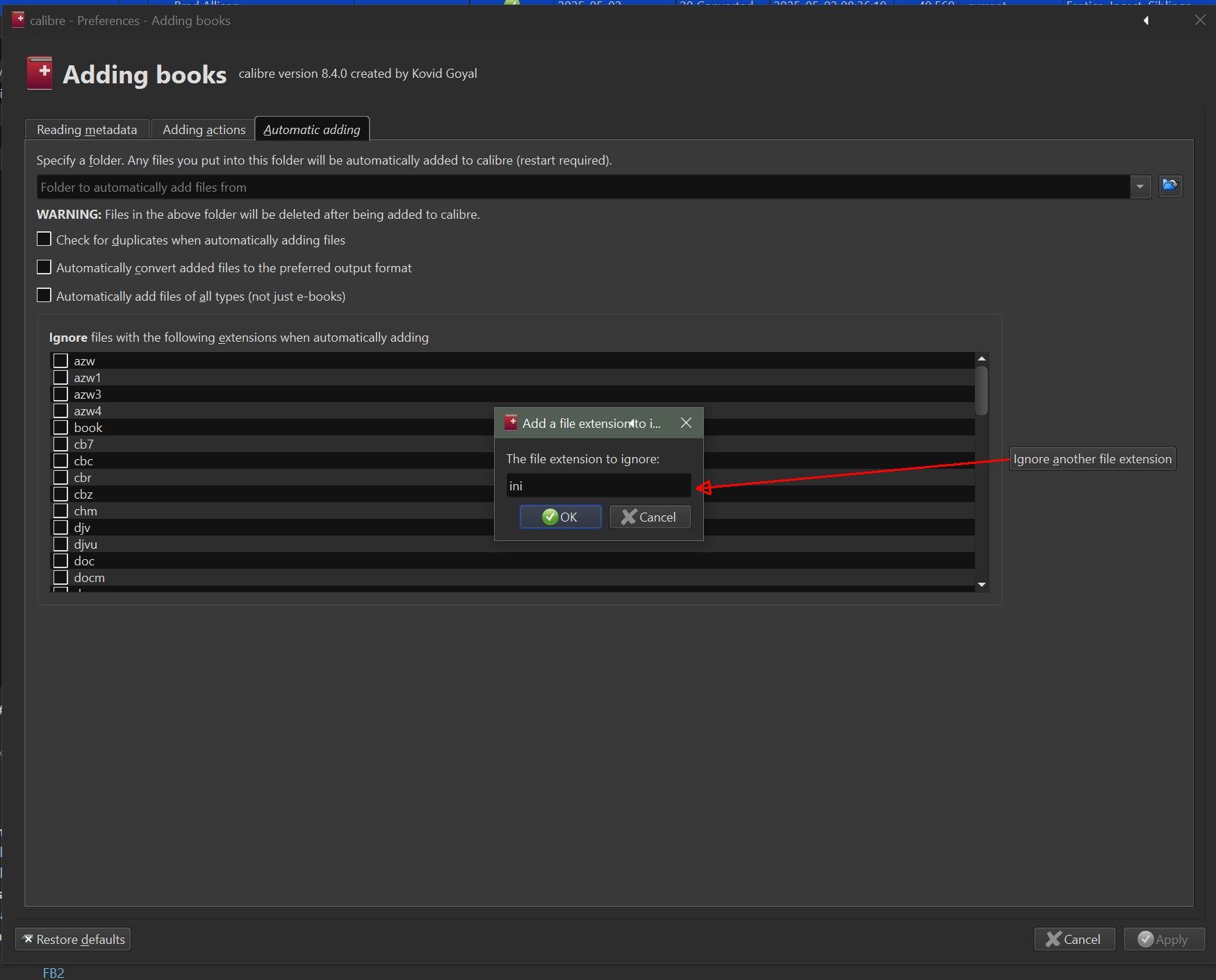 EDIT: I can disable all files, or add an exception for .ini in settings. EDIT: https://bugs.launchpad.net/calibre/+bug/2114200 Last edited by ownedbycats; 06-12-2025 at 12:04 PM. |