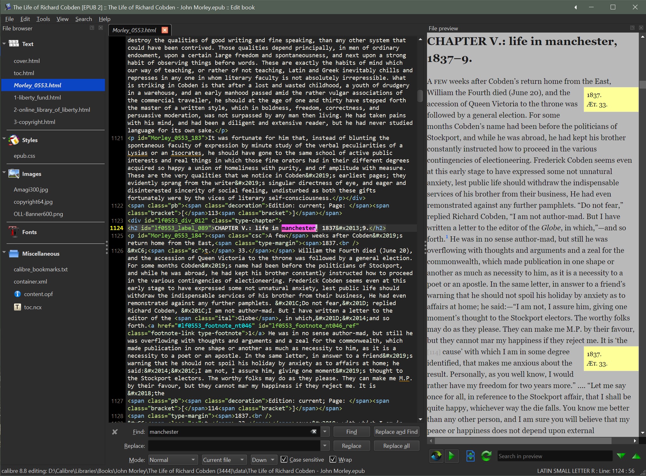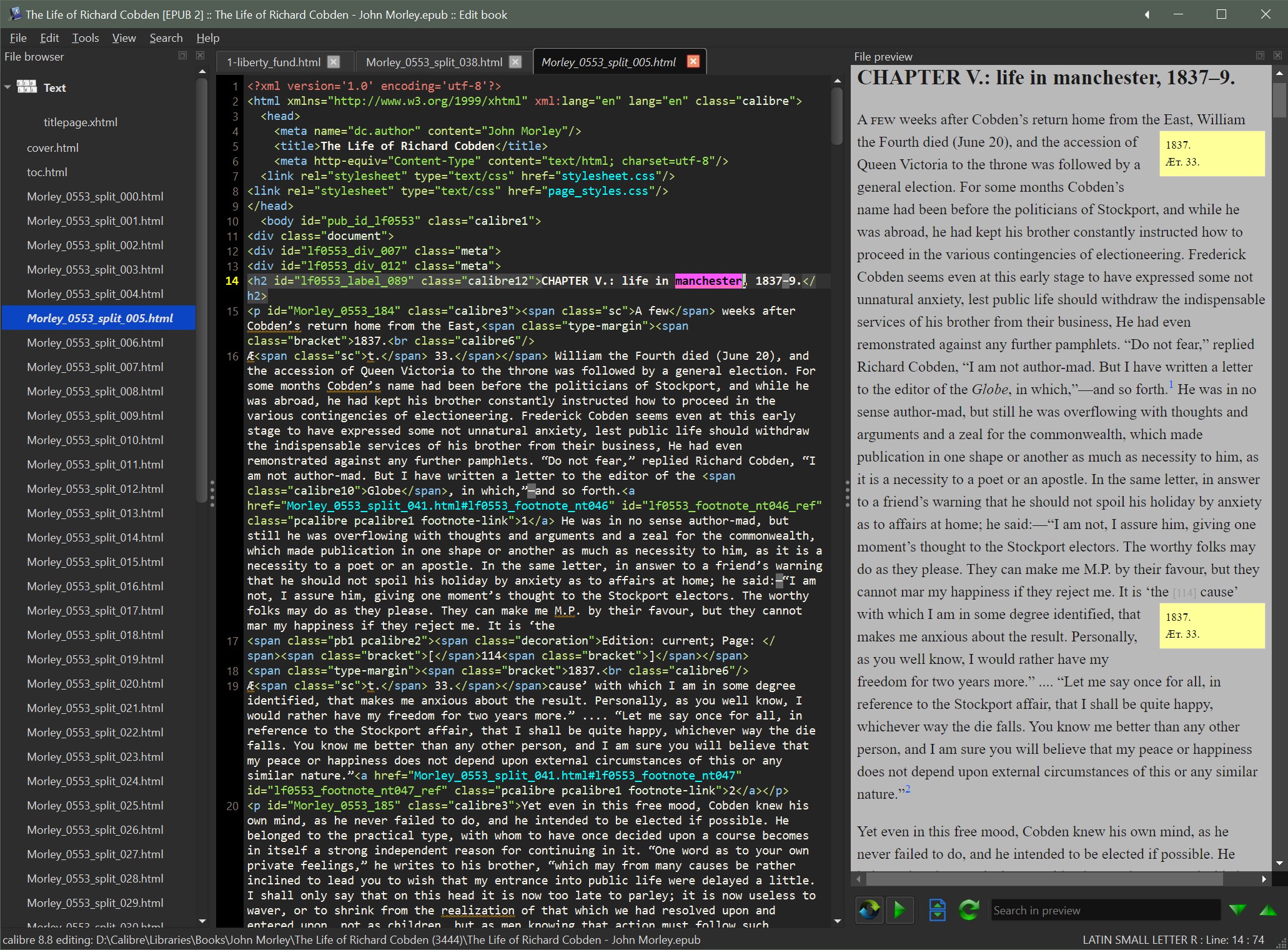 Input - substantive text is in 1 file - Morley_0553.html Output - substantive text is in 43 files - Morley_0553_split_000.html → Morley_0553_split_042.html Now you can unpack as previously suggested, perhaps after using the calibre editor to remove the unwanted artefacts. BR |
