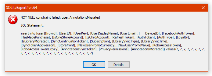 (For the record, I was migrating the data from my Kobo Touch to my Kobo Clara HD.) At Step 11 I ran into an error trying to paste the records. It turns out the (old) Kobo Touch had two additional columns in the user database called "PrivacyPermissions" and "AnnotationsMigrated" that do not exist in the (New) Kobo Clara's KoboReader.sqlite file. On the old Kobo's user data line I needed to right click and select "select columns" and then remove these two columns before pasting the new data in. |