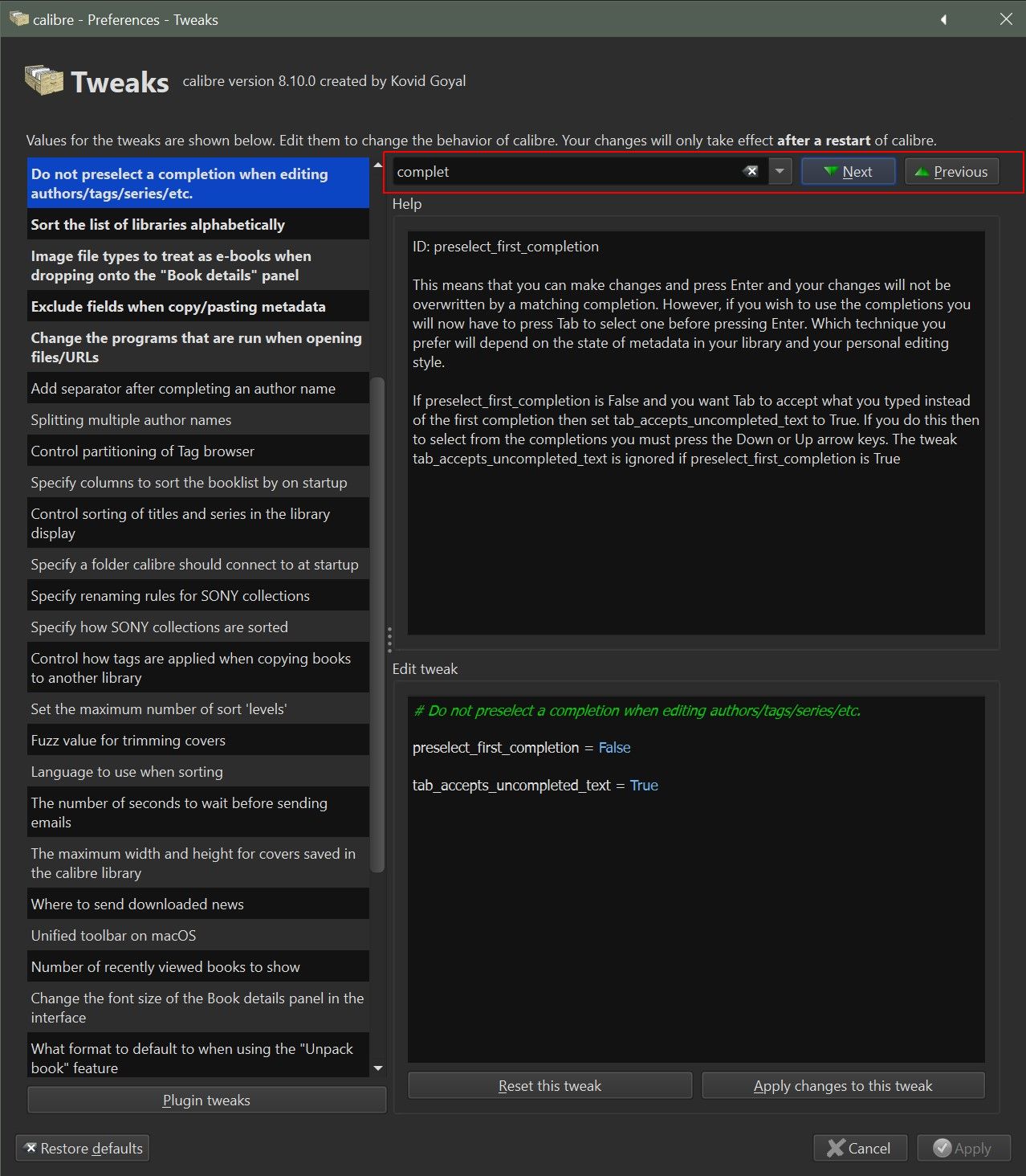 preselect_first_completion completion_mode Easiest way to find them is search for 'complet' in Tweak dialogue, viz: BR |