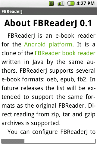 FBReaderJ is an e-book reader for the Android platform. It is a clone of the FBReader book reader written in Java.The new 0.2.3 release fixes the previous problem with slow zip and epub decompression. Currently, the only ebook formats supported are (DRM-free) oeb, epub, and fb2. |