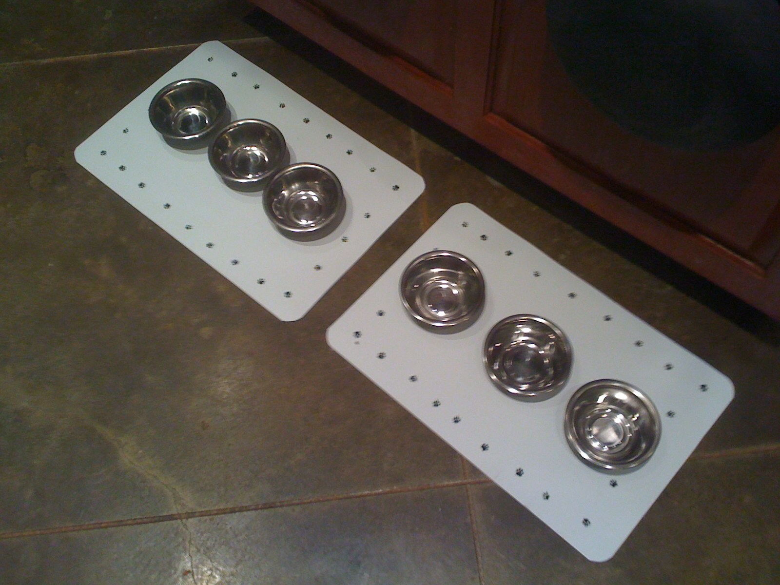 I took cut out style magnets (like the type you put on photos to stick them up) and cut them into round shapes to glue on the bowl bottoms. The magnets on the bowls and the ones on the mats were themselves too weak to hold, so I bought some disc type neodymium magnets (three per mat) and placed them where I want the bowls to go. The neodymium magnets hold on tight to the mat, so the cats can't move them off. They also stay on the mat when I pull the bowls off to wash them. I found the little paw print stickers at Wal-Mart, and those stay on the mats beautifully, even when I wash the mats. It was a fun little project. I'll probably write it up on my blog. |