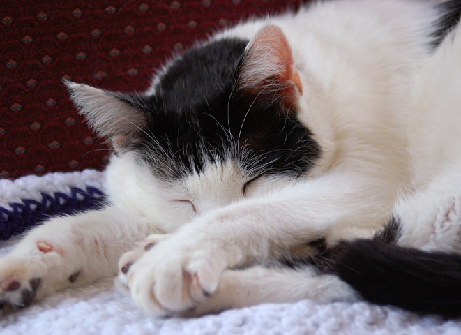 aw, what a pretty cat ! they always look so sweet and innocent when they are asleep don't they ? we know better than to be fooled though...